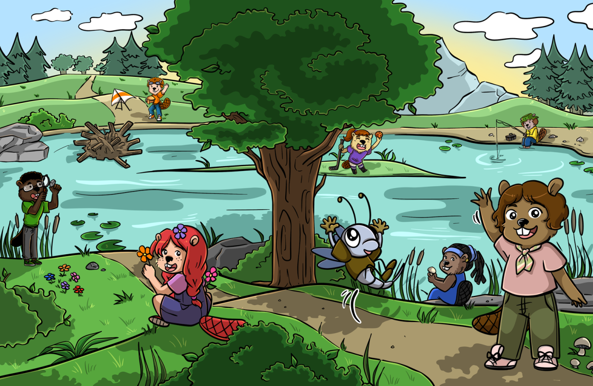 Dans leur odyssée Castors, les jeunes se plongent dans le monde imaginaire d’un étang où ils et elles feront la rencontre de mentors et de castors de six grandes familles (les six champs de développement du PICASSo) avec qui ils pourront se lancer des défis personnels. Ensemble, la colonie pourra construire de grands barrages (des grands projets) pour vivre des aventures scoutes.